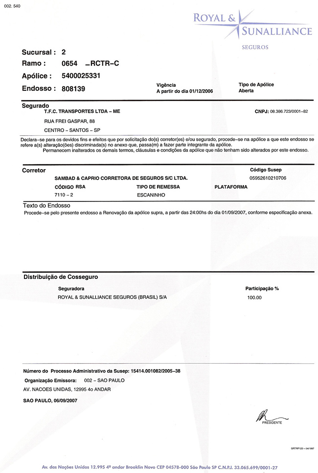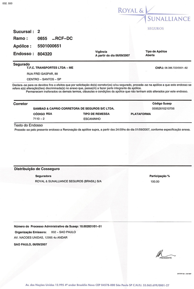 Juntos com a ROYAL & SUNALLIANCE SEGUROS, uma das principais seguradoras de cargas atuando no ramo, e a DI-CAPRIO CORRETORA DE SEGUROS, atendemos aos clientes possuindo os seguintes seguros:
